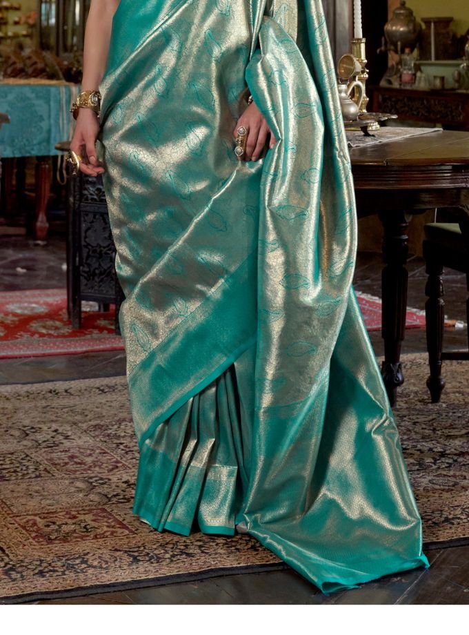 Aqua Green Kanjivaram Handloom Weaving Silk Saree With Blouse Piece
