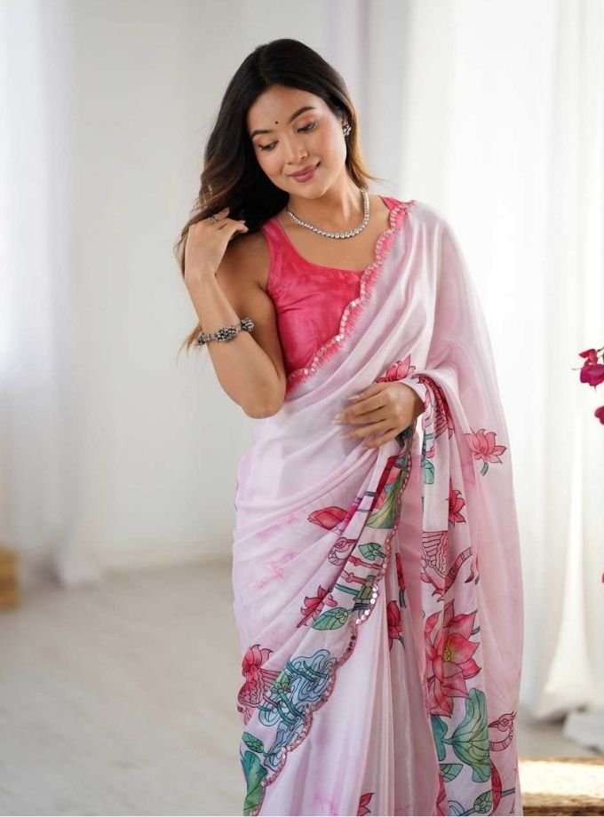 Baby Pink Chinon Digital Printed Fancy Saree With Blouse Piece
