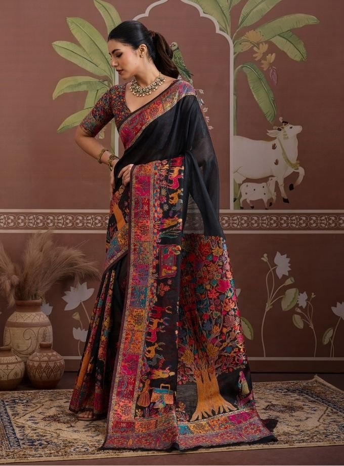 Elegant pashmina weaving saree with vibrant traditional prints and a rich detailed border—perfect for festive and ethnic occasions.