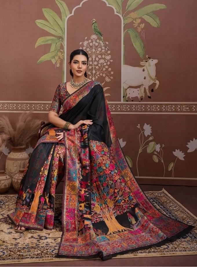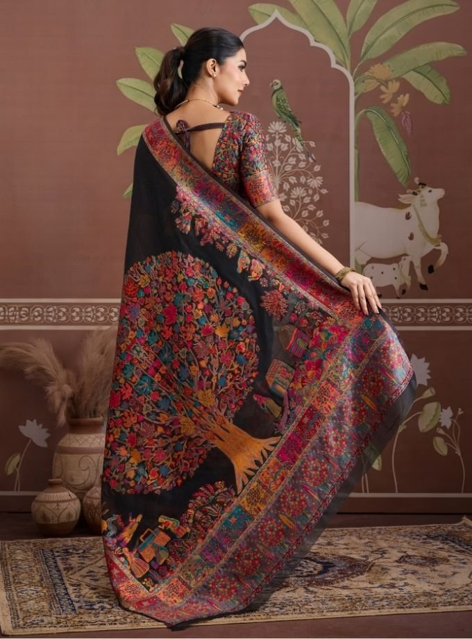 This elegant saree features a soothing pashmina base adorned with vibrant multicolor traditional weaving. The intricate border showcases detailed motifs inspired by heritage art, adding a rich and festive touch. Paired with a beautifully patterned blouse, this saree blends classic charm with modern grace—perfect for weddings, festive occasions, or cultural events.