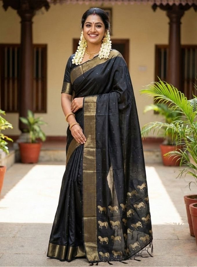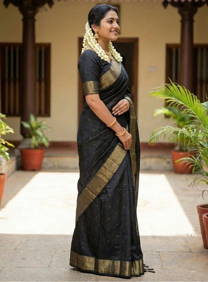 This elegant soft silk saree radiates freshness and grace. Crafted with a smooth, lustrous finish, it features a rich golden border that adds a touch of traditional charm. The subtle woven details enhance its sophistication, making it perfect for festive occasions, celebrations, and cultural gatherings. Paired beautifully with classic jewelry, this saree offers a timeless and refined look. 💚✨