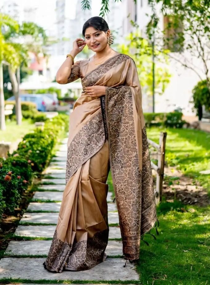 Chikku Kalamkari Handloom Raw Silk Saree And Rich Weaving Pallu With Blouse Piece