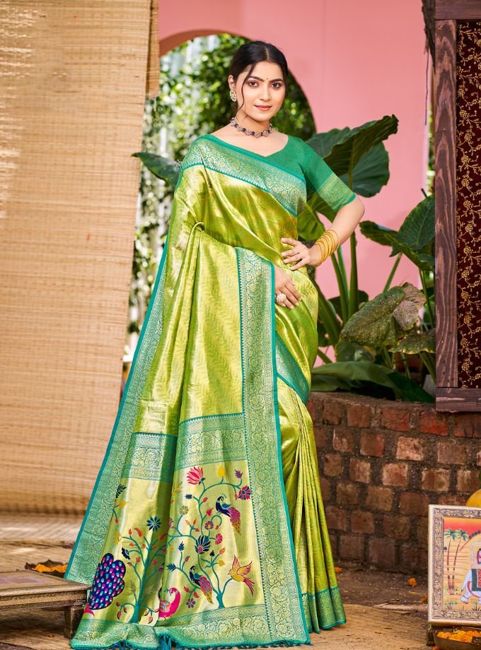 Kanchipuram saris woven with heavy silk and gold cloth are considered to be special and are worn on occasions and festivities. The special features of a Kanjivaram saree are its use of pure mulberry silk for a rich, heavy texture and vibrant colors, intricate zari work made with real gold and silver threads, a unique separate weaving of the border and body that are then interlocked, and a wide variety of traditional motifs inspired by temples and nature, creating a luxurious, durable, and treasured heirloom.