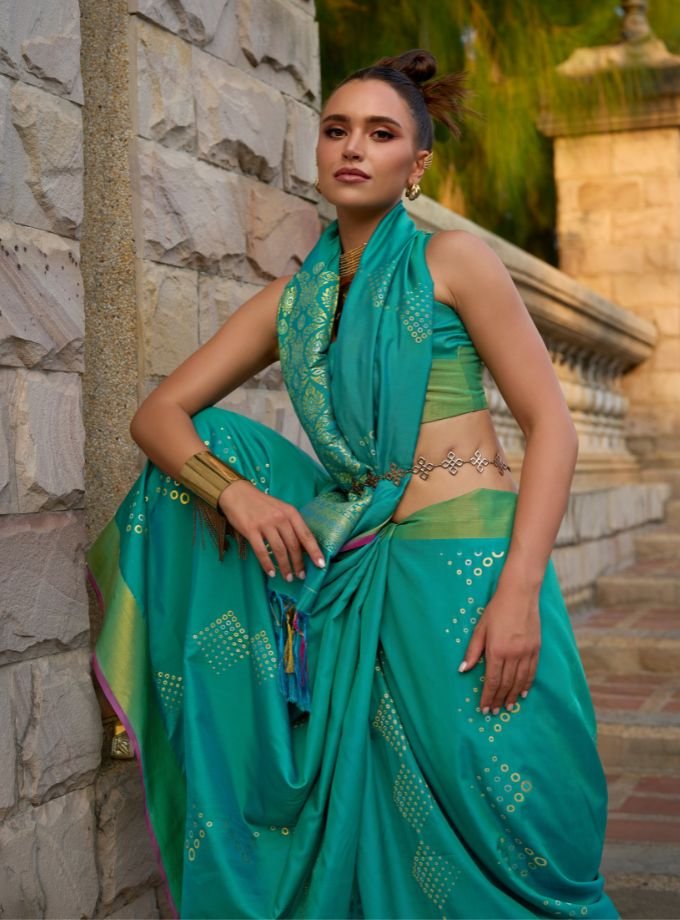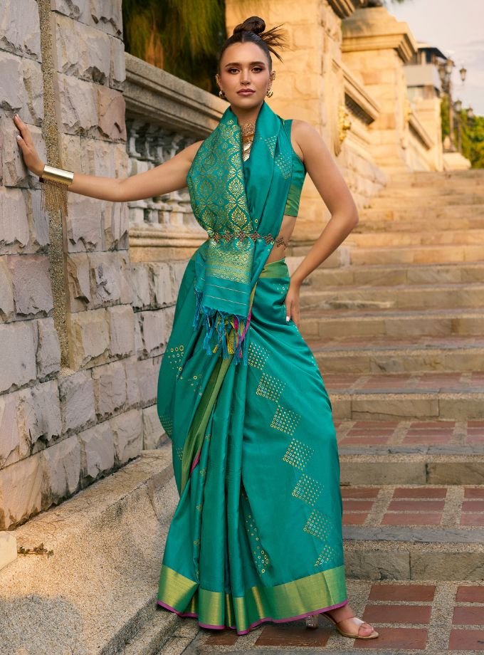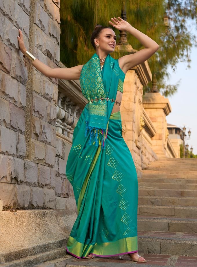 Green & Blue Handloom Weaving Satin Silk Saree With Blouse Piece