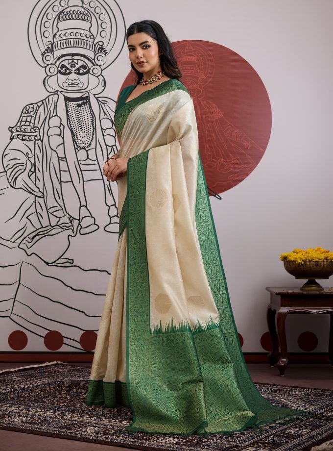 An elegant ivory saree adorned with delicate woven motifs, beautifully contrasted by a rich green intricately border. Crafted for timeless appeal, this saree drapes gracefully and is paired with a matching blouse, making it perfect for festive occasions, cultural celebrations, and refined evening wear.