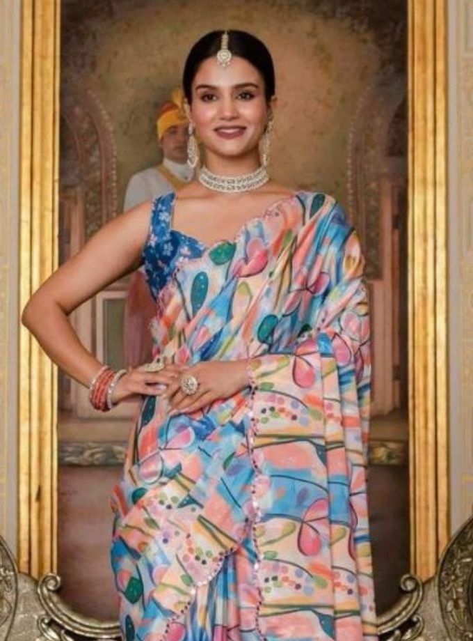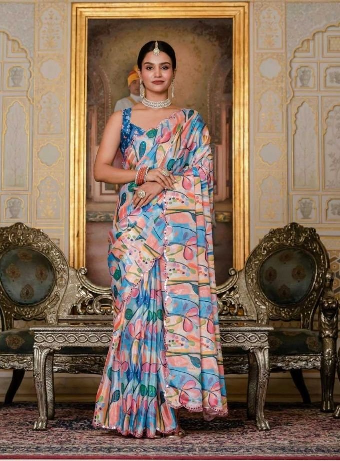 Elegant chinon floral printed saree with a soft, elegant drape—perfect for festive and special occasions. 🌸✨