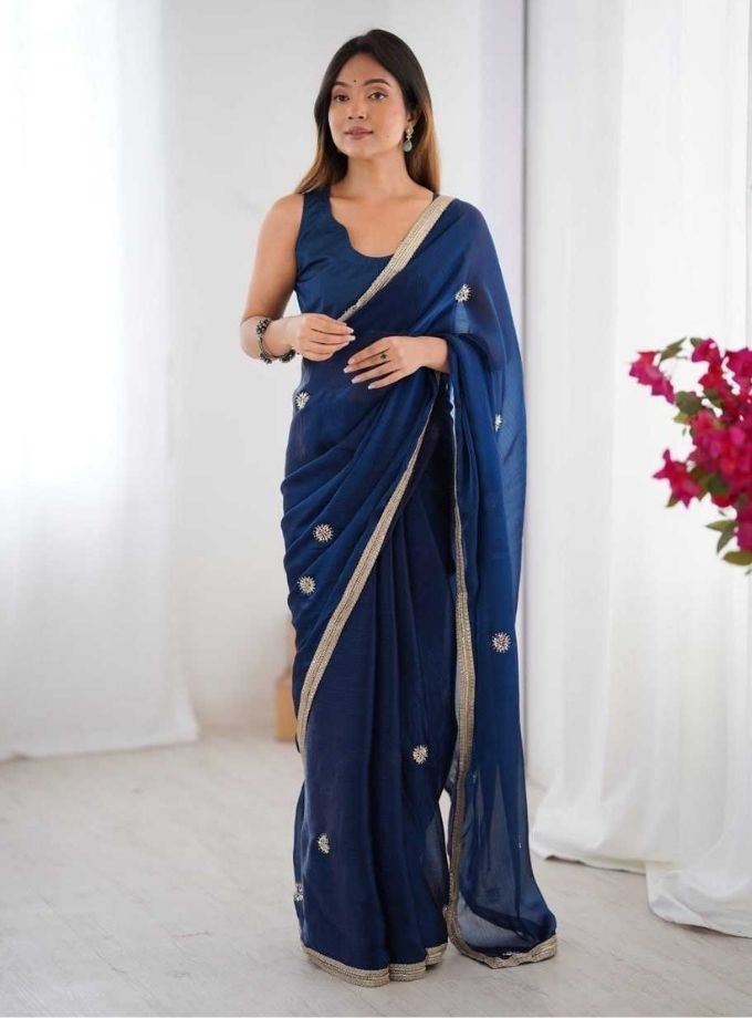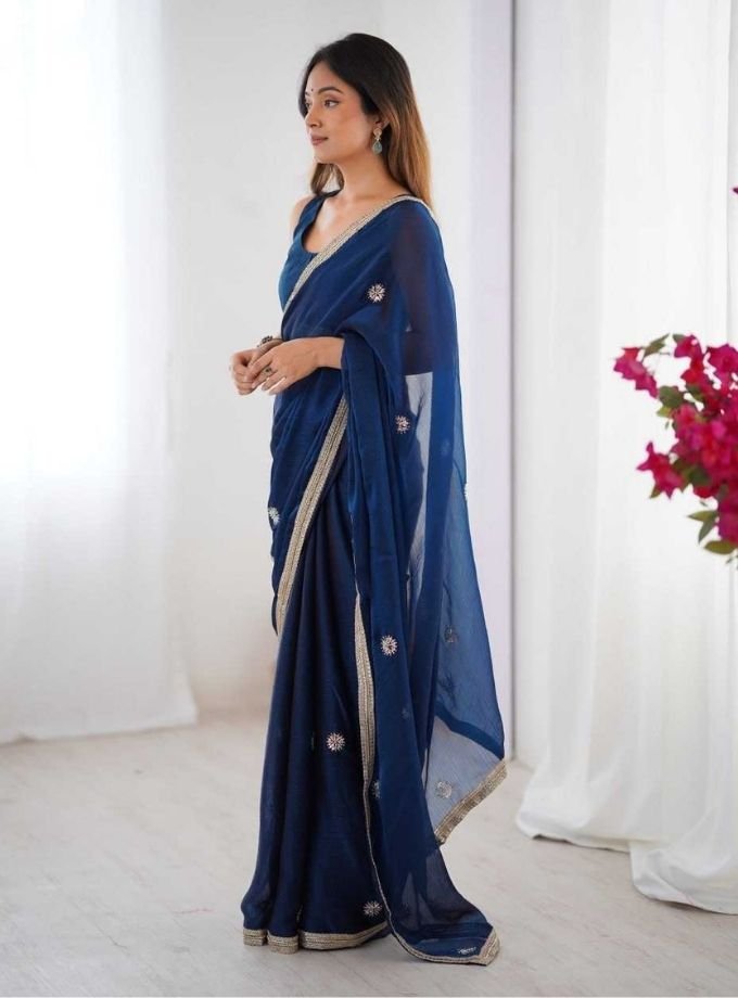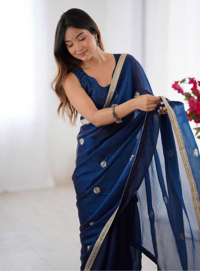 Navy Blue Designer Embroidered Sequins Work Fancy Saree With Blouse Piece