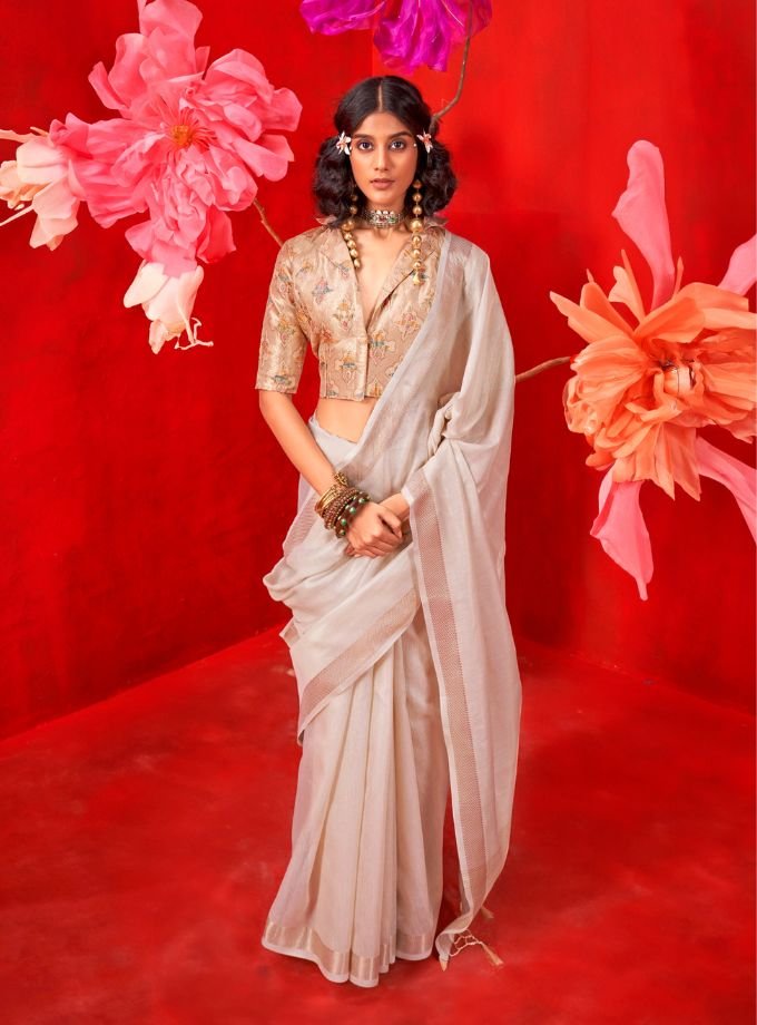 Off White Zari Tissue Handloom Weaving Silk Saree With Blouse Piece