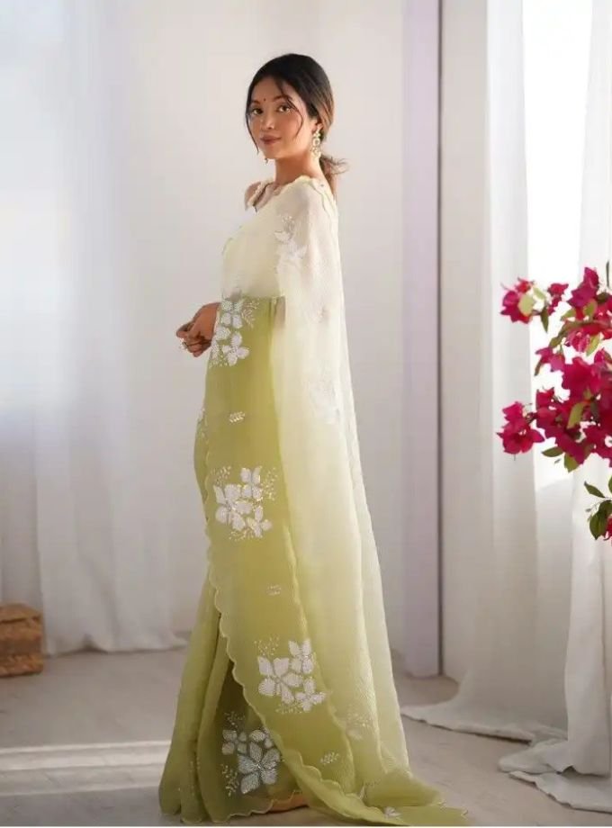 A soothing fancy saree adorned with delicate white floral embroidery, featuring a soft lightweight drape and elegant scallop border — a perfect pick for festive and daytime celebrations. 🌿✨