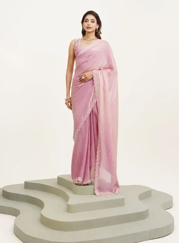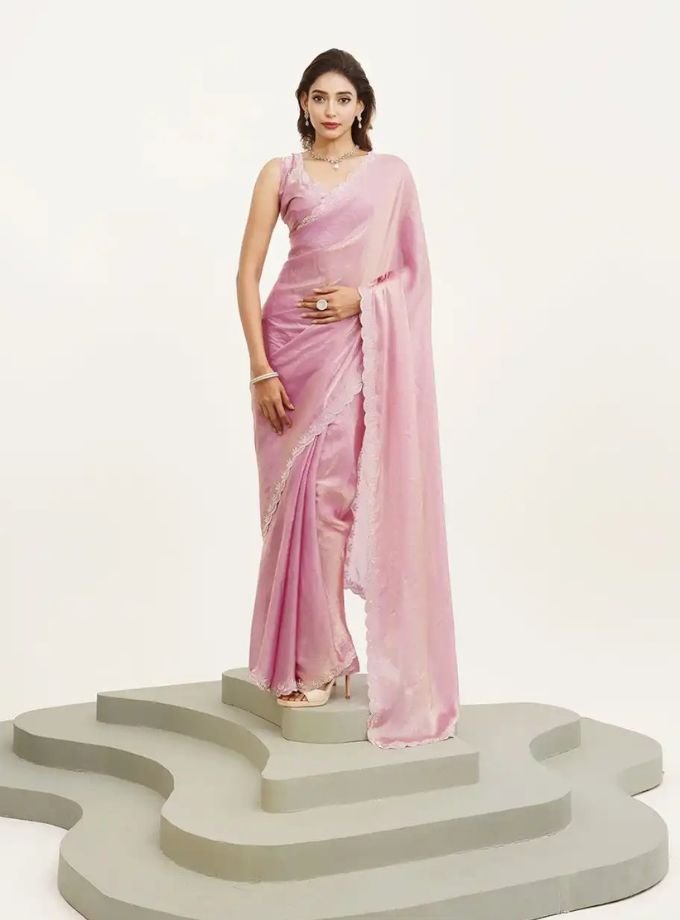 Soft pastel pink saree with a smooth, flowy drape and delicate lace-style embellished border, perfect for elegant festive and daytime occasions.