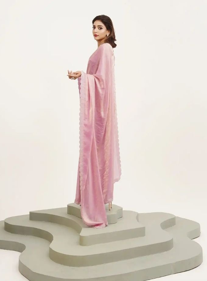 This pastel pink saree exudes soft elegance with its smooth, fluid drape and beautifully detailed lace-style embellished border. Crafted from a lightweight, graceful fabric, it offers both comfort and sophistication. Its subtle sheen and feminine charm make it an ideal choice for festive events, daytime celebrations, and special occasions where understated luxury is desired.
