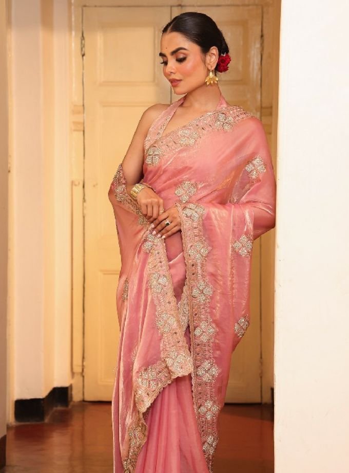 Fancy tissue saree featuring elegant and zari embroidereda rich designer border—perfect for weddings, festivals, and special occasions..