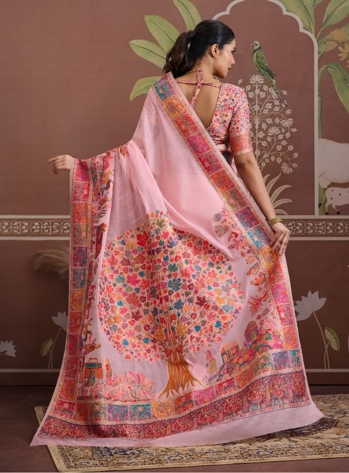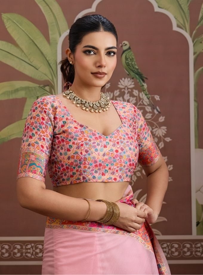 This elegant saree features a soothing pashmina base adorned with vibrant multicolor traditional weaving. The intricate border showcases detailed motifs inspired by heritage art, adding a rich and festive touch. Paired with a beautifully patterned blouse, this saree blends classic charm with modern grace—perfect for weddings, festive occasions, or cultural events.