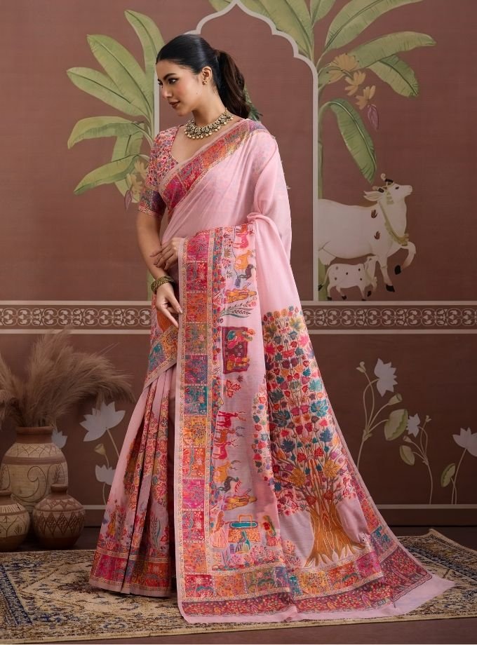 Elegant pashmina weaving saree with vibrant traditional prints and a rich detailed border—perfect for festive and ethnic occasions.