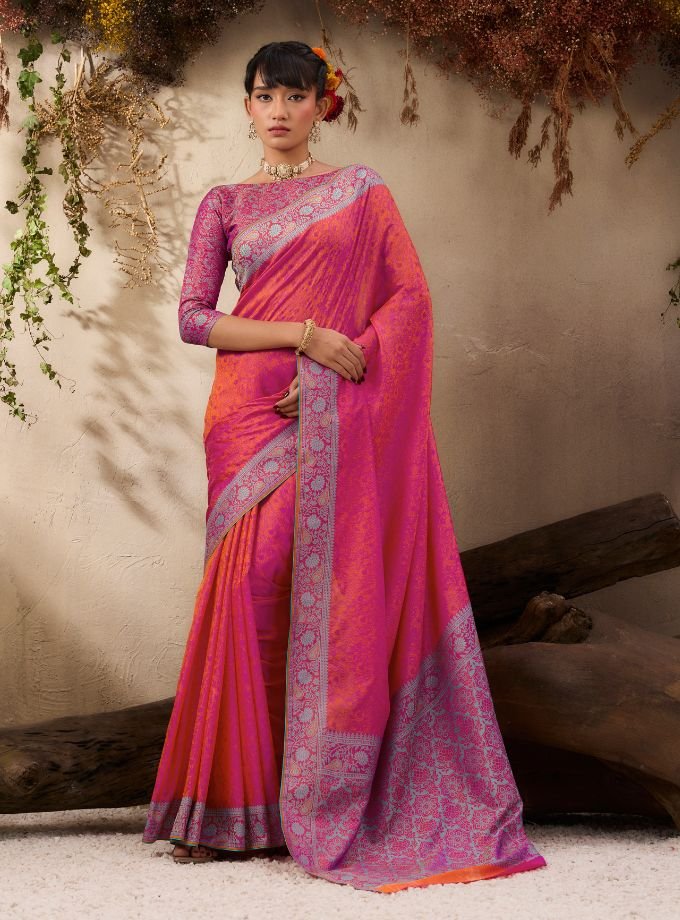 Rich Fuchsia Silk Saree with an elegant woven border, featuring intricate traditional motifs for a regal finish. Perfect for weddings and festive occasions, this saree blends vibrant color with a luxurious sheen, giving a graceful and sophisticated look.