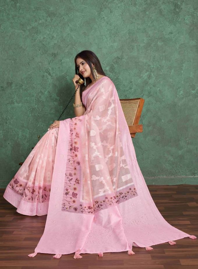 Pink Pure Cotton Lucknowi Woven Print Banarasi Saree With Blouse Piece