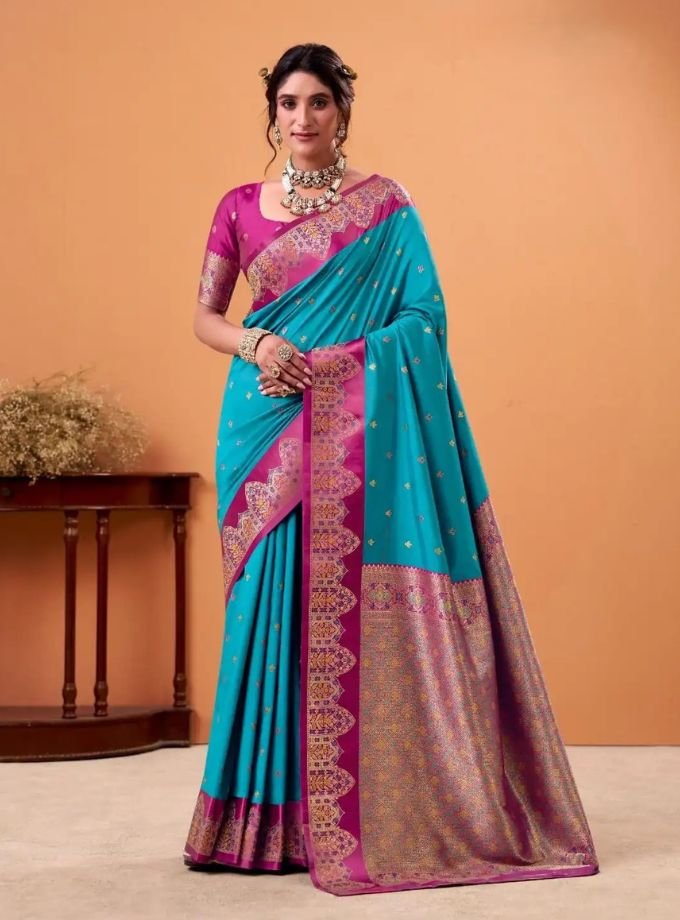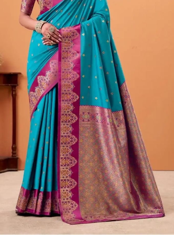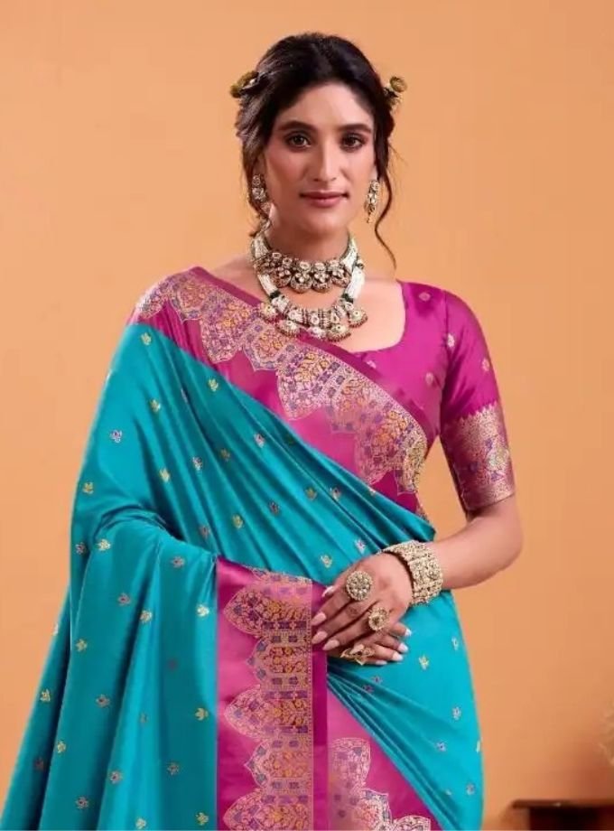 Elevate your ethnic charm with this exquisite sapphire blue Banarasi saree. Crafted with rich zari borders and intricate woven motifs, it beautifully blends traditional craftsmanship with timeless grace. Perfect for weddings, festive occasions, and celebrations.