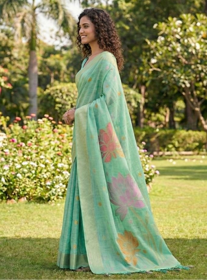 Elegant Linen cotton saree with subtle floral prints, lightweight and elegant—perfect for a fresh daytime look. 🌿✨