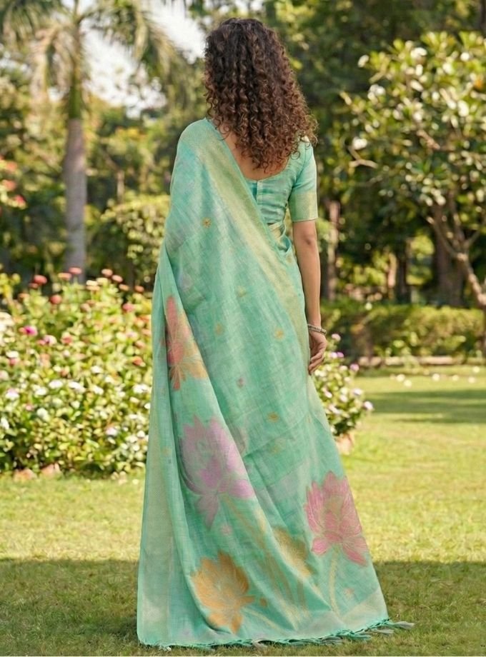 Sea Green Linen Cotton Saree With Blouse Piece