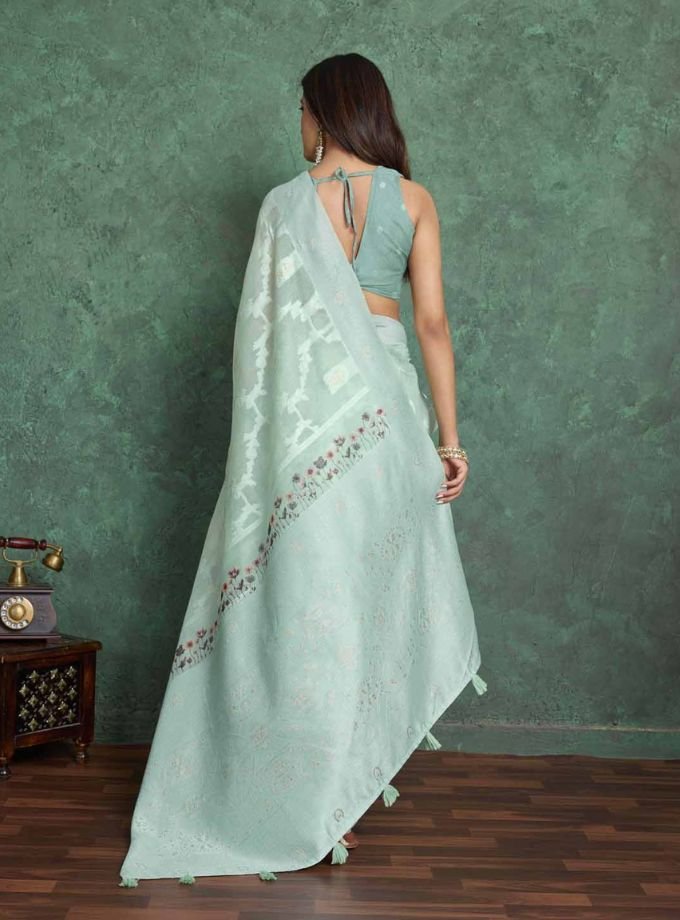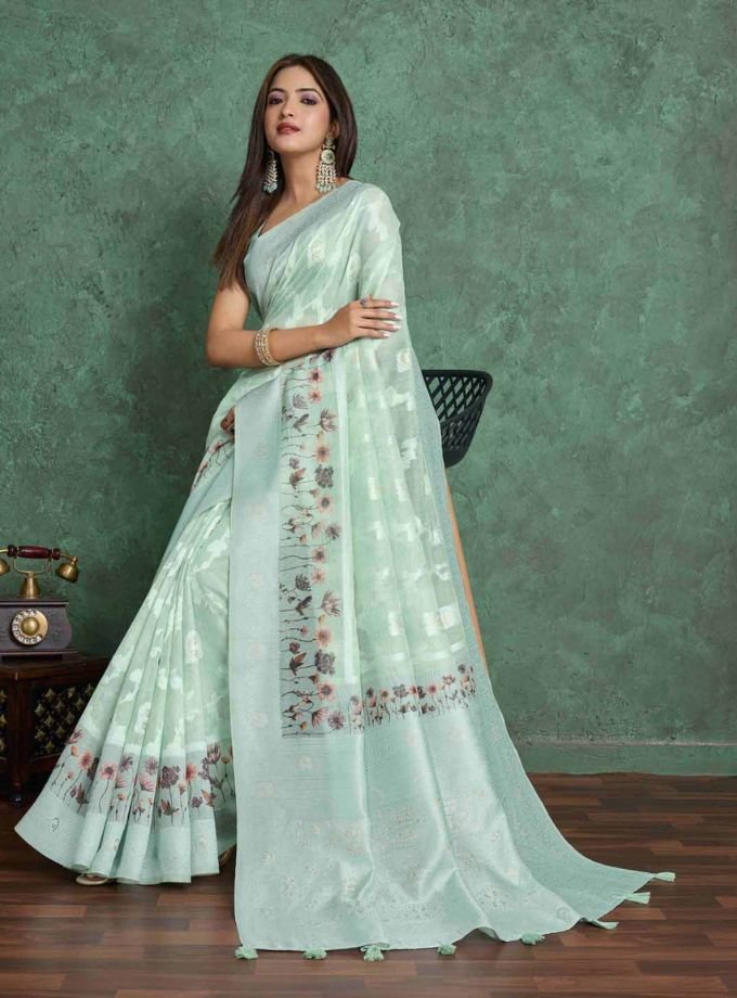 Sea Green Pure Cotton Lucknowi Woven Print Banarasi Saree With Blouse Piece