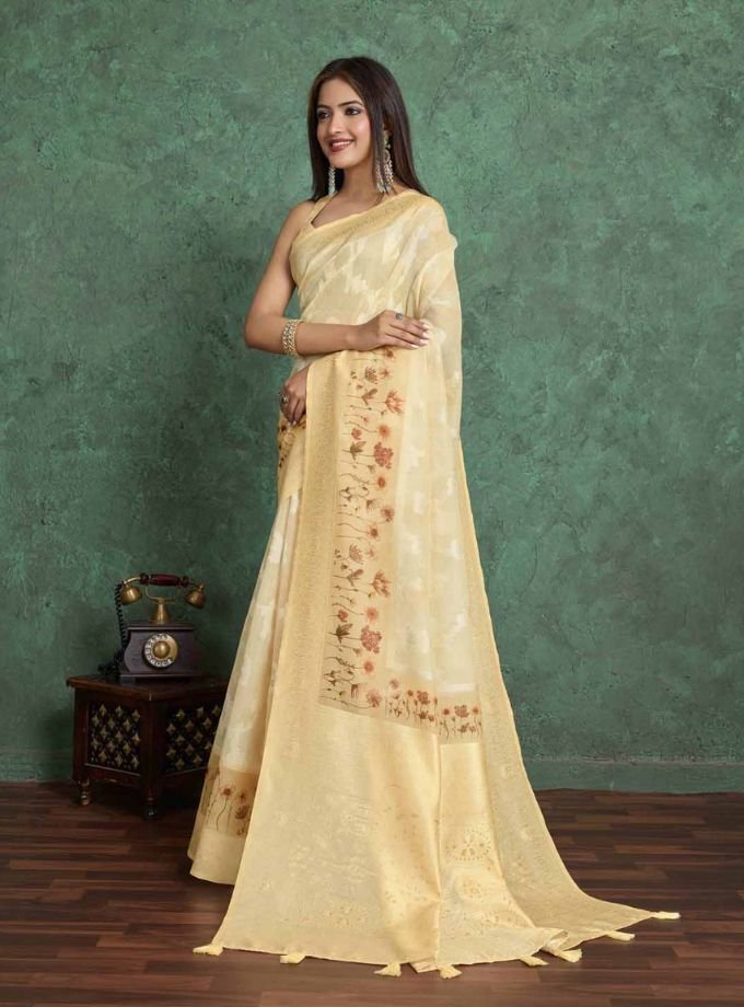 This saree is used for special occasions, such as weddings, festivals, and other grand celebrations. Soft spun x cotton lucknowi woven saree with position digital prints + pure cotton jhaalar.